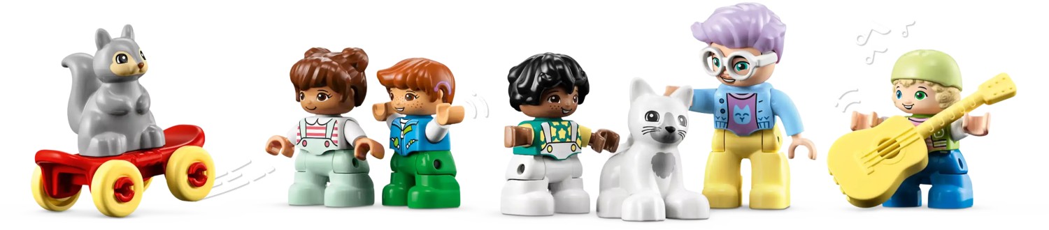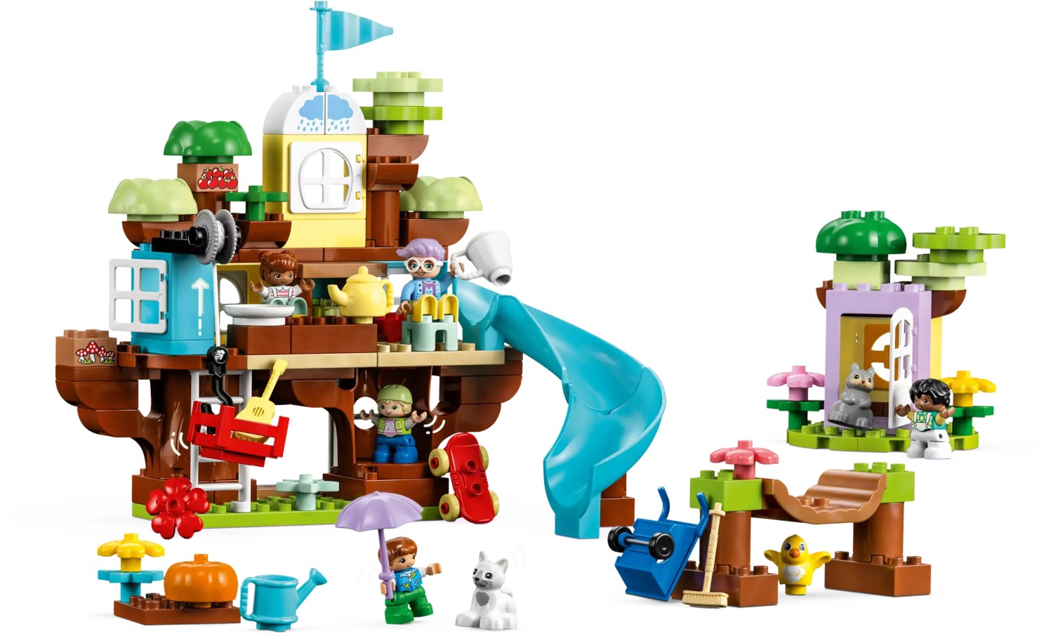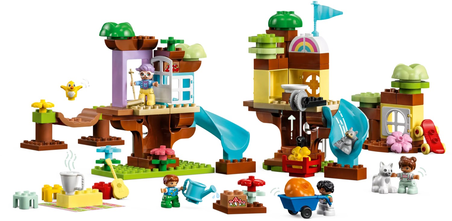 Kleine Abenteurer ab 3 Jahren werden große Freude daran haben, das LEGO® DUPLO® 3-in-1-Baumhaus (10933) und seine unzähligen spannenden Spielmöglichkeiten zu entdecken. Das Baumhaus beinhaltet jede Menge Details und Funktionen und kann auch in 2 weitere Modelle umgebaut werden, um Kinder kreativ werden zu lassen. Spielerisch lernen, fantasievoll spielen. Als Erstes bauen die Kinder den ultimativen Abenteuerspielplatz mit dreigeschossigem Baumhaus, superlanger Rutsche und wackeliger Brücke. Wenn dann Regenwolken aufziehen, lässt sich das Modell in ein gemütliches Baumhaus umbauen. Das dritte Modell besteht aus 2 Baumhäusern mit jeweils einer Rutsche sowie aus einem Garten, in dem die Kinder Obst ernten und dann mit dem Seilzug hinaufhieven können. Kleinkinder lernen spielerisch. Dieses Set beinhaltet ganz unterschiedliche Figuren, darunter auch eine Großmutter, 4 Kinder, einen Vogel, eine Katze und ein Eichhörnchen, damit Eltern mit ihrem Kleinkind spielen, ihm Sozialkompetenzen vermitteln und das Zusammenspielen beibringen können. Diverses Zubehör lässt kleine Baumeisterinnen und Baumeister kreativ werden und unzählige fantasievolle Geschichten darstellen.