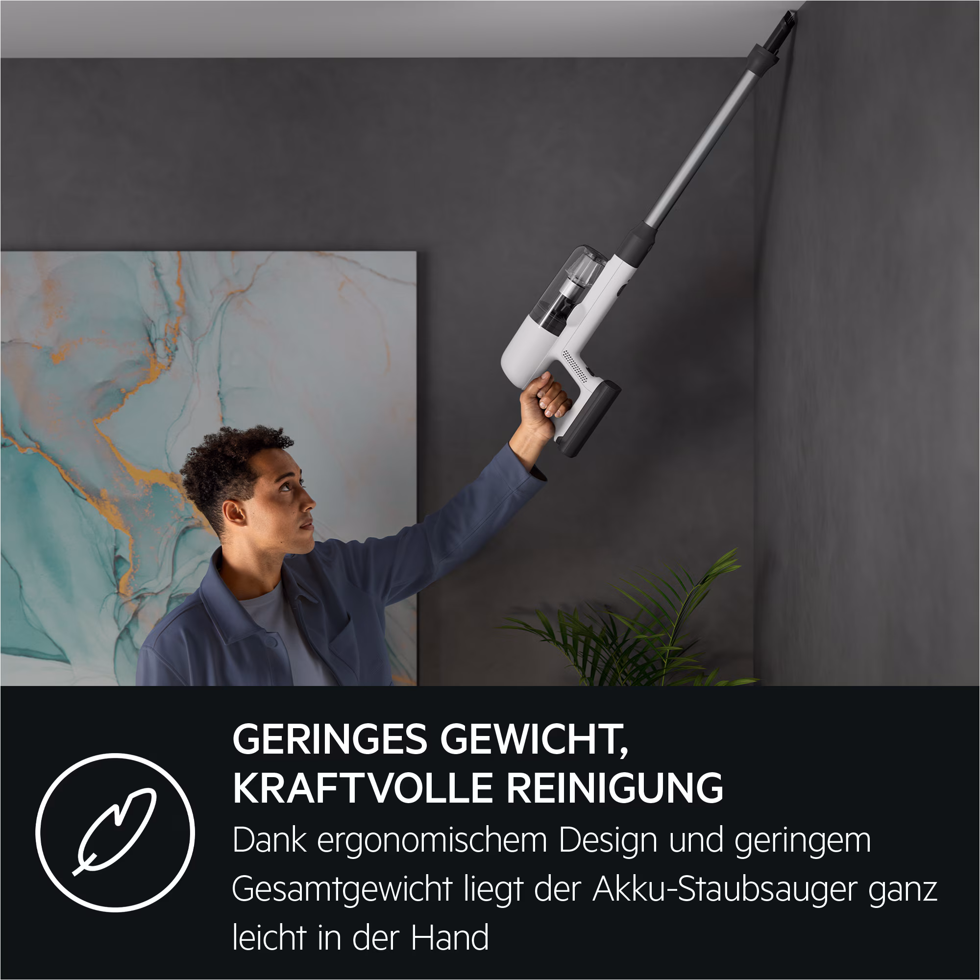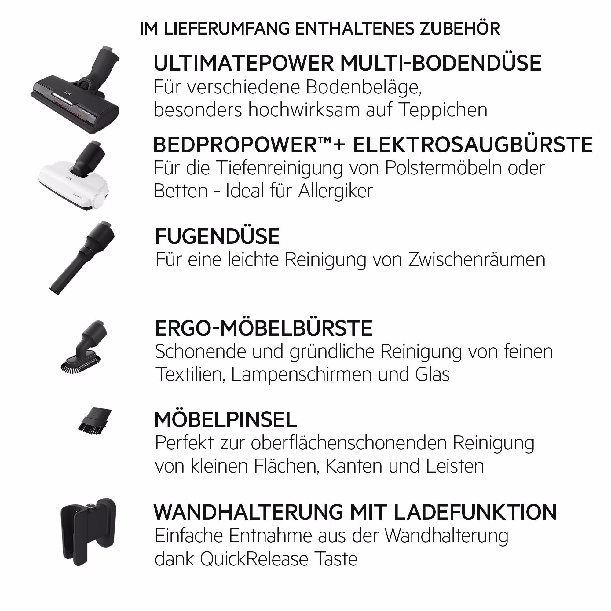 Typ: Handstaubsauger, Stielsauger • Betriebsart: Akkubetrieb (14.4V, 4.0Ah, Li-Ionen) • Farbe: weiß, grau • Filterung: ja • Besonderheiten: Frontlicht, Ladekontrollleuchte • Betriebsdauer: 50min • Ladedauer: 4.5h • Gewicht: 3.21kg • Lieferumfang: Ladestation (zur Wandmontage), Möbelpinsel, Fugendüse, Möbelbürste (Ergo)