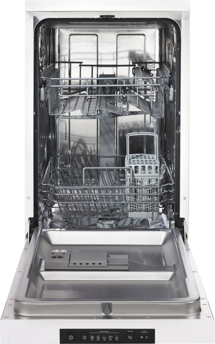 Freistehender Geschirrspüler, 45cm, E, 9 Maßgedecke, 2 Geschirrkörbe, HxBxT: 84,5x44,8x60cm, Farbe: Weiß, Maximale Temperatur Wasserzufluss: 60 °C, Steuerung: Tasten, halbe Beladung, Besteckkorb, 5 Programme, Wasserverbrauch: 9 Liter, Geräuschpegel dB (A) re 1 pW: 47 dB(A)re1pW