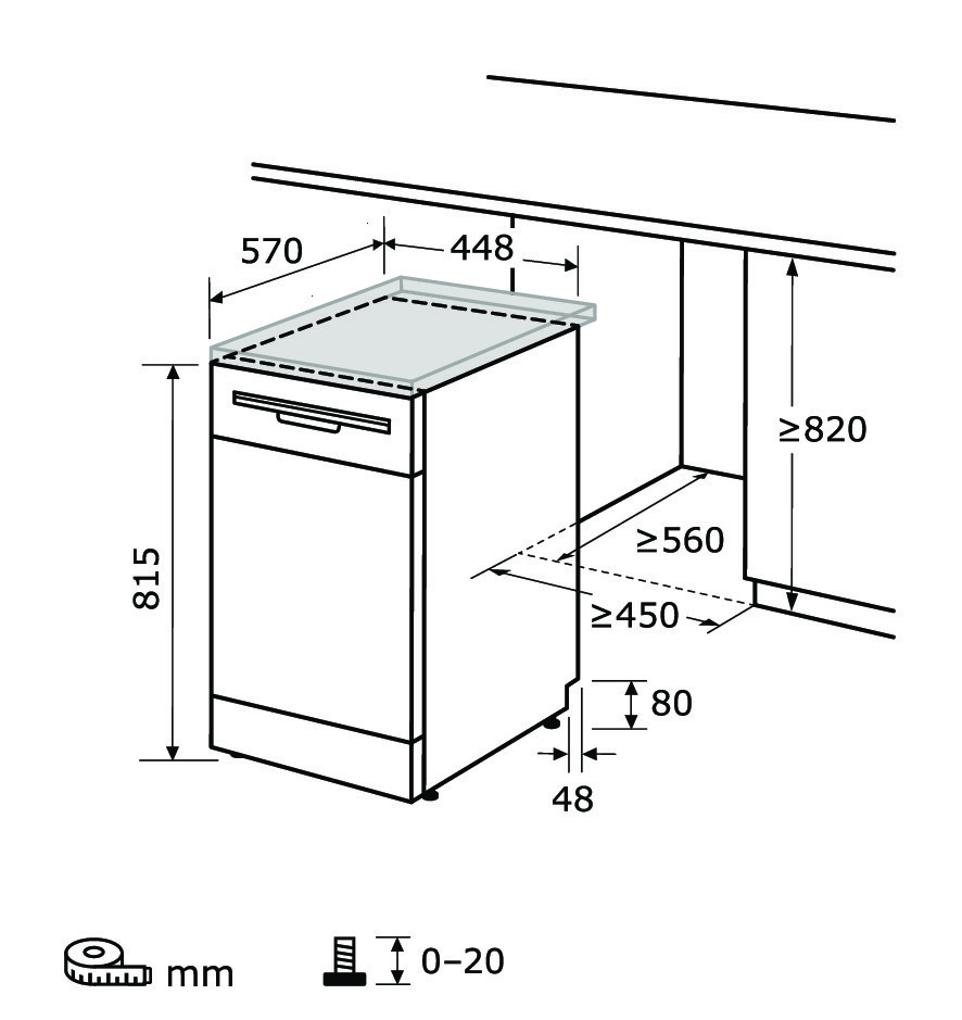 Eine 45 cm breite Lücke ist optimal für das Gerät. Eine geringe Aussparung oder Lücke kann dazu führen, dass das Gerät nicht passt.