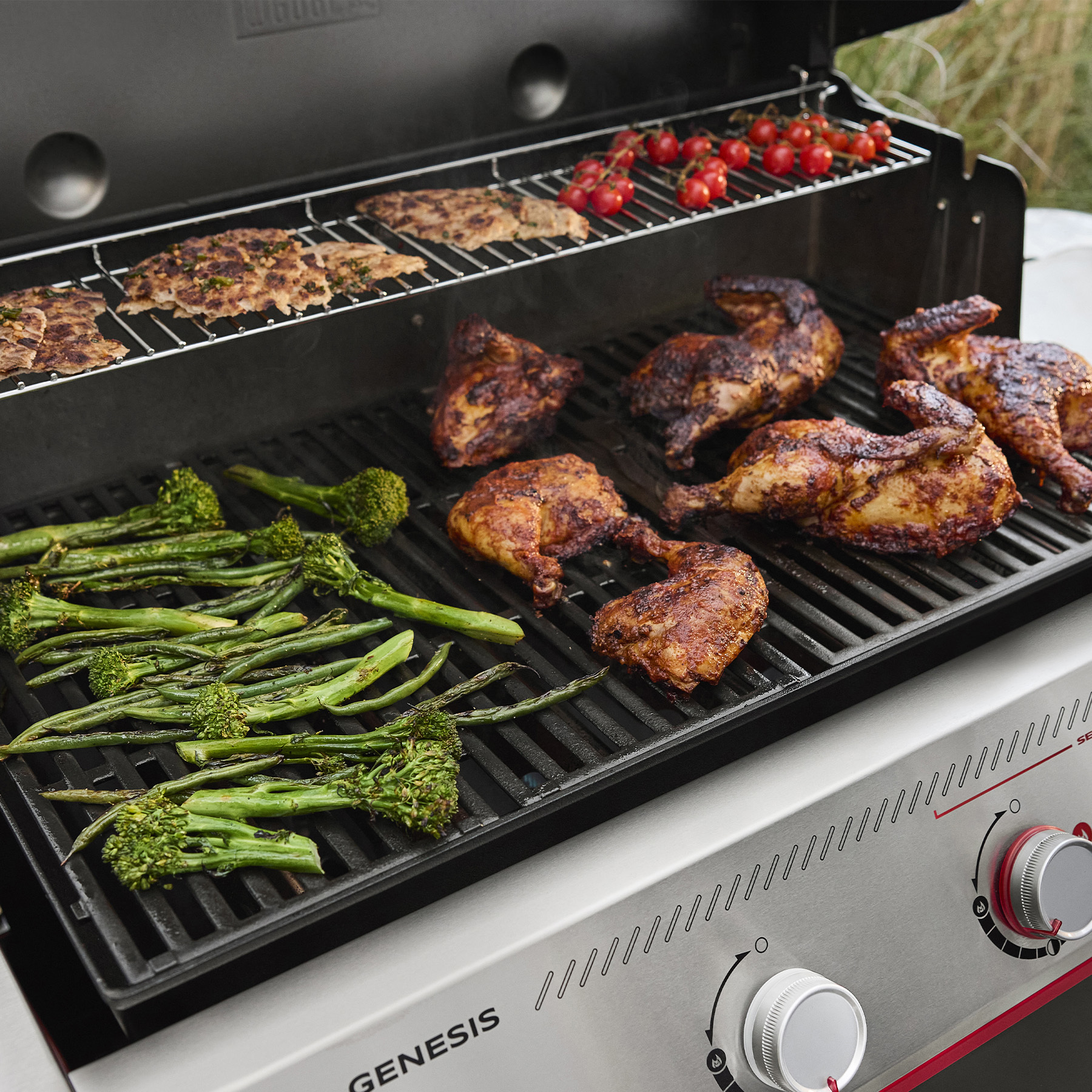 Beeindrucke deine Gäste und erweitere deine Grillkünste mit dem leistungsstarken, neu erfundenen Genesis® EPX-435W smarten Gasgrill mit 4 Brennern, Sear-Brenner, Seitenbrenner und WLAN-fähigem digitalem Thermometer. Dieser Grill liefert intensive Hitze und unglaubliches Aroma mit einem speziellen Sear-Brenner, der bis zu 50 % mehr Leistung in der extragroßen Sear Zone freisetzt, um Fleisch, Fisch und Gemüse auffällige, aromatische Grillmuster zu verleihen. Immer die perfekte Garstufe mit dem WLAN-fähigen digitalen Thermometer, das mit einem kabelgebundenen Temperaturfühler ausgestattet ist. Verbinde ihn mit der Weber Connect® App zur Überwachung aus der Ferne und erhalte Benachrichtigungen auf deinem Smartphone, wenn der Grill vorgeheizt ist und dein Grillgut gewendet werden kann. Erziele gleichmäßige Hitze auf den Grillrosten mit dem hocheffizienten PureBlu® Brenner-System, das zuverlässig entzündet und einen konstanten Gasfluss aufrechterhält. Freue dich auf einen Seitenbrenner zum Schmoren oder Sautieren und die im Griff integrierte Nightvision® LED-Grillbeleuchtung, die sich automatisch einschaltet, wenn du den Deckel anhebst. Außerdem gibt es einen erweiterbaren oberen Grillrost, der deine Grillfläche vergrößert und perfekt für kleineres Grillgut ist. Entdecke neue Welten des Grillens mit den Weber Crafted® Gourmet BBQ System Grillrosten. Diese Roste haben einen Einsatz, in den das runde Gourmet BBQ System Grillzubehör passt, und die Grillroste lassen sich umdrehen, damit sie für das Weber Crafted® Grillzubehör passen. So hast du die ultimative Grillvielfalt, um deinen Grill mit einer Plancha, einem Sear Grate, Pizzastein, Grillkorb und Vielem mehr zu verwandeln (Grillzubehör separat erhältlich). Halte Grillwerkzeuge, Gewürze und vorbereitetes Grillgut griff-, grill- und servierbereit – mit den großen, individuell gestaltbaren Seitentischen, die für Weber Works Drop-in- und Snap-on-Zubehör (separat erhältlich) geeignet sind. Organisiere und verstaue alles im großen Seitenschrank, damit du bereit bist, wenn dein nächstes Grillabenteuer ansteht.