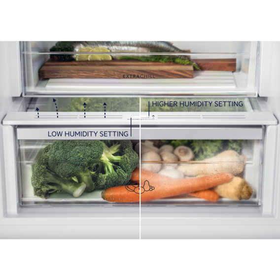 Genießen Sie köstliches Gemüse mit unserer Humidity Control Schublade. Dank der Luftfeuchteregelung schafft sie die beste Umgebung, um Lebensmittel zu lagern. Durch das Schließen der Lüftungsöffnungen schaffen Sie den idealen Platz zur Lagerung von Kräutern und Blattgemüse und durch das Öffnen eine optimale Lagerung.