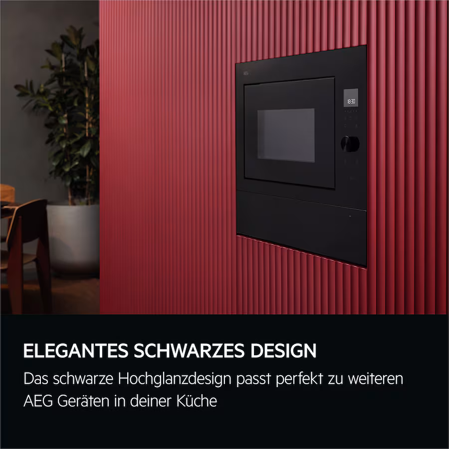 Das minimalistische Design der Mikrowelle in schwarzer Hochglanzoptik passt zum Backofen und anderen AEG Geren in deiner Khe.