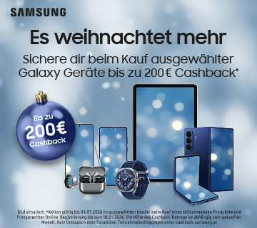 Teilnahme ab 18 Jahren. Gültig nur für teilnehmende Samsung Aktionsmodelle aus der offiziellen Geräteübersicht . Der Cashback variiert je nach Modell und ist im Aktionszeitraum gültig. Die vollständigen Bedingungen findest du hier .
