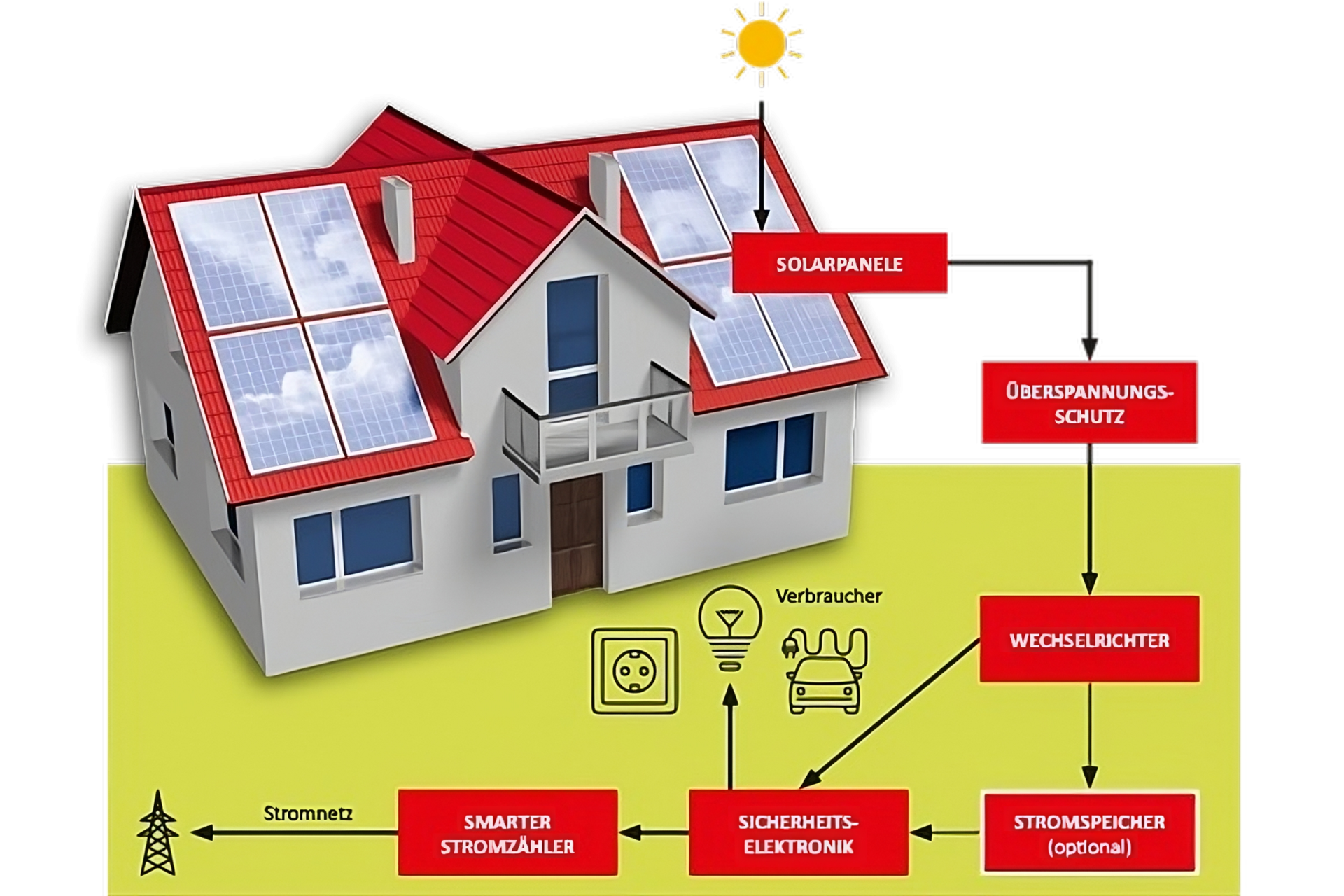 - Stromspeicher (optional): Speichert überschüssige Energie, die nicht sofort benötigt wird, für den späteren Gebrauch.