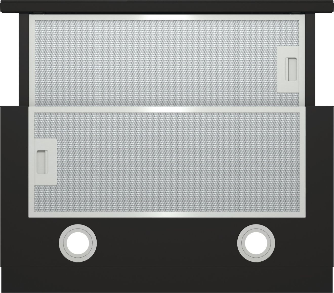 Flachschirm-Dunstabzugshaube, Integrierbar 60cm, HxBxT 17x60x30,6cm. Farbe: Schwarz, Material Gehäuse/Kamin: Edelstahl&Glass, Polyurethanfilter, Bedienung: Drucktasten, Geräuschpegel max.: 67 dB(A)re1pW