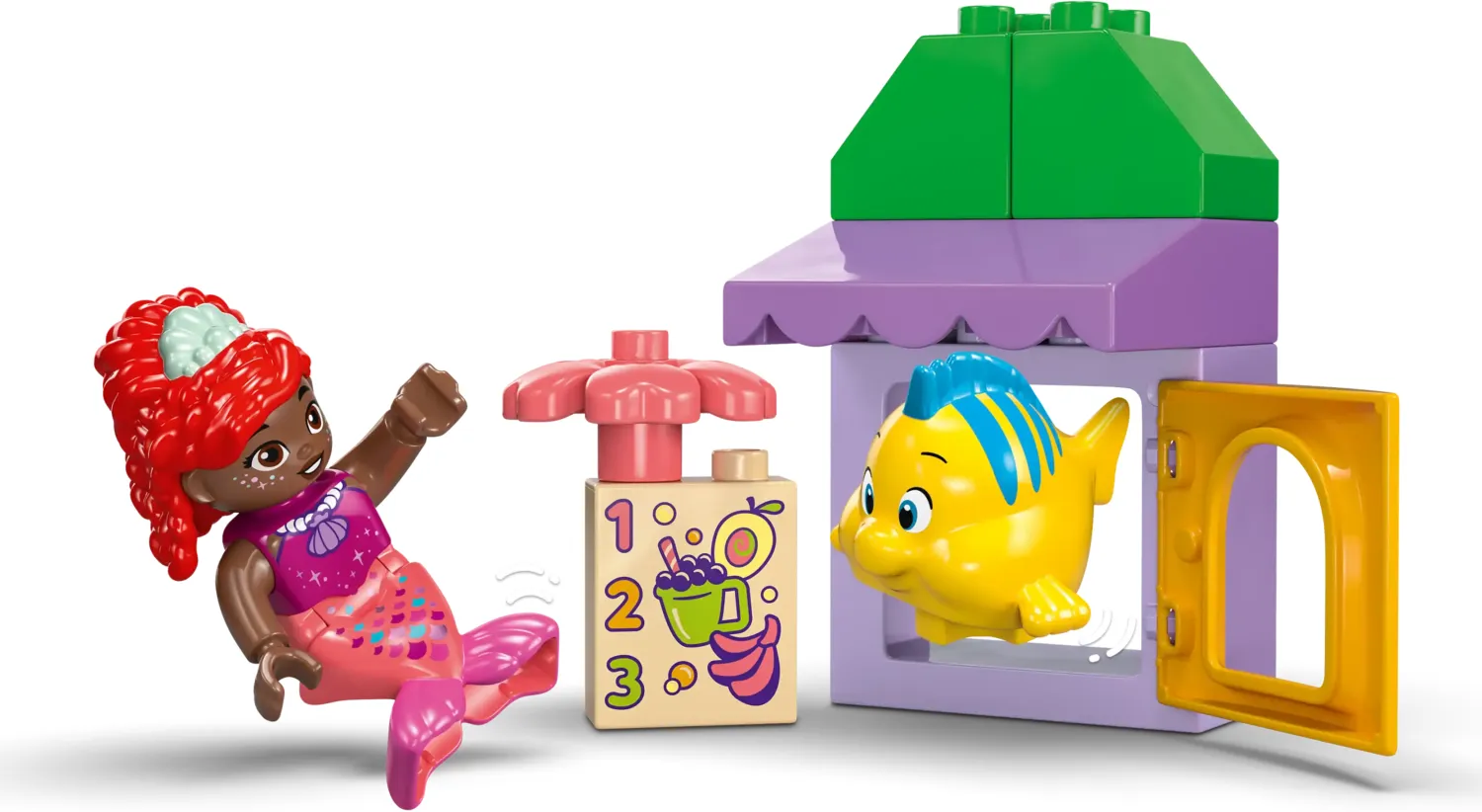 LEGO® DUPLO® | Disney Arielles und Fabius‘ Café-Kiosk (10420) ist ein Bauspielzeug für viele spannende Unterwasserabenteuer. Vorschulkinder ab 2 Jahren können sich dort mit ihren geliebten Figuren treffen, die sie aus der TV-Serie Ariel auf Disney Junior kennen.Dieses LEGO DUPLO Bauspielzeug beinhaltet eine Sitzgruppe aus Tisch und Stühlen sowie diverse Früchte. Das baubare Spielzeug-Café hat eine Verkaufstheke mit aufklappbarem Fenster, damit kleine Baumeister ihre Fingerfertigkeit üben können.Dieses Bauspielzeug lässt Vorschulkinder fantasievoll und kreativ spielen. Eltern können beim gemeinsamen Spielen wichtige Lernschritte ihrer Kinder miterleben. Kleinkinder schauen zu und ahmen die Erwachsenen nach, wenn sie dann selbst Abenteuer mit den beiden LEGO DUPLO Figuren Arielle und Fabius nachstellen. Und wenn sie die Gefühle benennen, die die beiden Figuren in der jeweiligen Spielsituation empfinden, lernen sie etwas über Emotionen. Dieses lehrreiche Bauset lässt Kleinkinder außerdem logisches Denkvermögen entwickeln, wenn sie mit den leicht greifbaren Steinen Szenen aus der TV-Serie nachstellen.