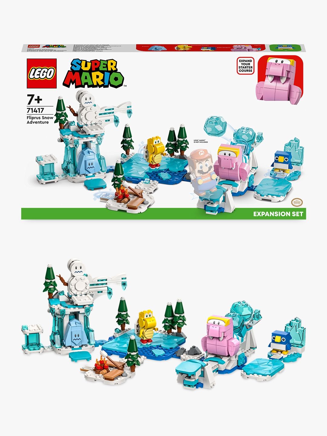 Dein Kind kann seine LEGO® Super Mario™ Welt mit dem Kahlross-Abenteuer – Erweiterungsset (71417) und den 4 enthaltenen Super Mario™ Charakteren um ein spannendes Eis-Level ergänzen. Die Spieler verdienen sich digitale Münzen, indem sie LEGO Mario™, LEGO Luigi™ oder LEGO Peach™ (Figuren nicht enthalten) helfen, einen roten Koopa, einen Froster und ein Kahlross zu besiegen, über das Eis gleiten, sich am Feuer aufwärmen und dem Baby-Pinguin die verborgene Frucht schenken. Hinweis: Zum Spielen wird das Starterset 71360, 71387 oder 71403 benötigt. Begleit-App Lade dir die LEGO Super Mario App mit Bauanleitungen, coolen Tipps und vielen weiteren tollen Ideen herunter, die deinem Kind ein noch spannenderes kreatives Erlebnis bieten. Tolle Geschenkidee Dieses Spielset zum Sammeln ist ein grandioses Geschenk für Kinder ab 7 Jahren. Die LEGO Super Mario Startersets und Erweiterungssets lassen Fans eigene Levels auf besondere Weise erweitern, umgestalten und anpassen und beim Spielen viele Münzen sammeln.