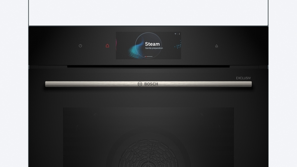 HSG738DB1 Einbau-Dampfbackofen, 60 x 60 cm, Schwarz. Der Dampfbackofen mit digitalem Bedienring und TFT-Touchdisplay. Bosch Assist, PerfectBake Backsensor Plus, PerfectRoast Bratenthermometer Plus und Dampf-Funktion Plus. Zusätzlich kann Home Connect bei der Bedienung über die App genutzt werden.