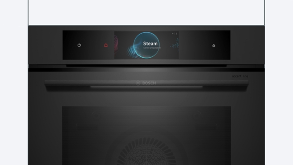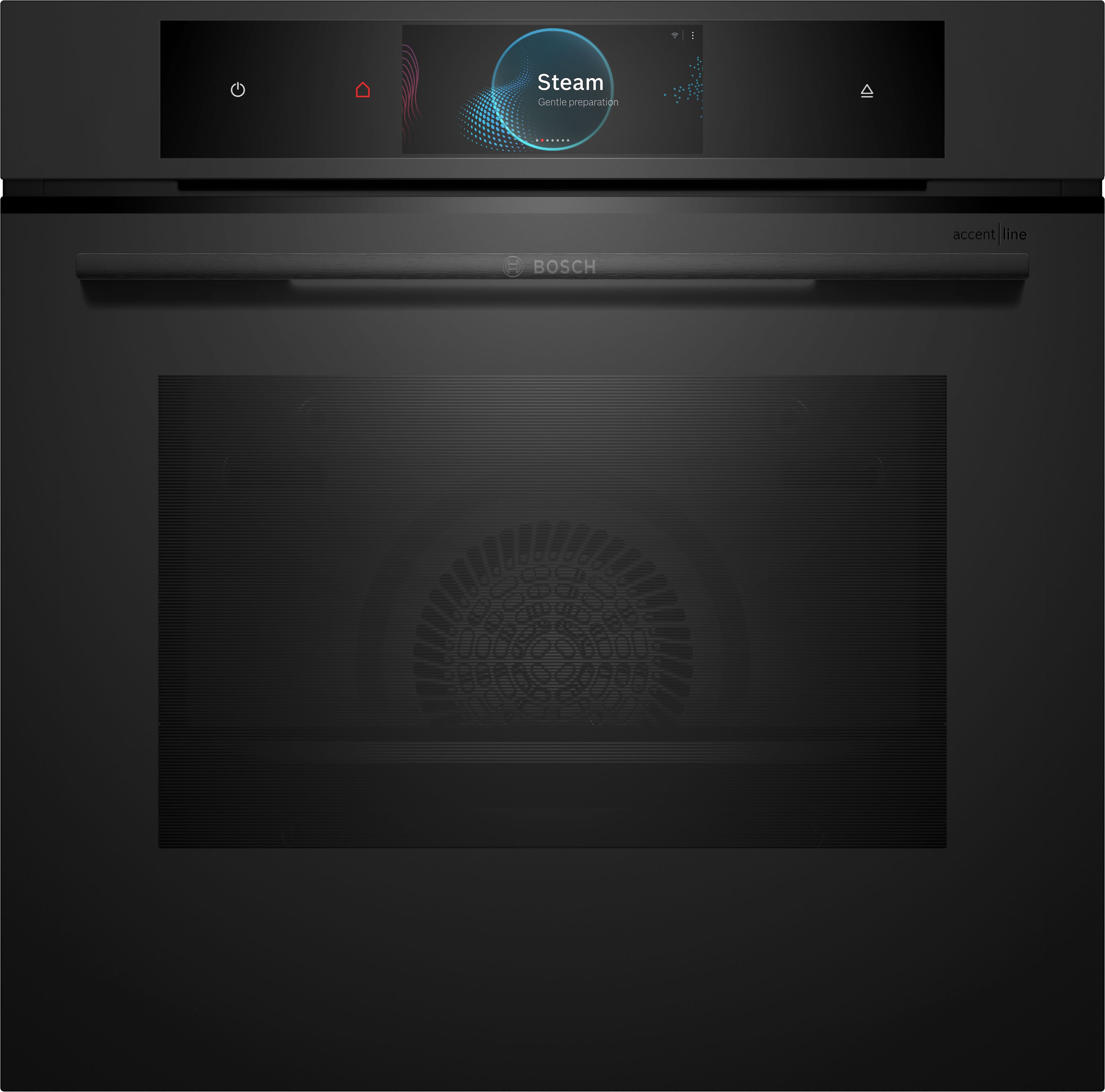 HSG938EM1 Einbau-Dampfbackofen, 60 x 60 cm, Matt schwarz. Der Dampfbackofen mit digitalem Bedienring und TFT-Touchdisplay. Kamera, Backofenassistent mit Sprachsteuerung, PerfectBake Plus, PerfectRoast Plus: für automatisch perfekte Gerichte, Dampgaren mit Sous Vide und schonendes Dämpfen. Home Connect zur Steuerung per App.