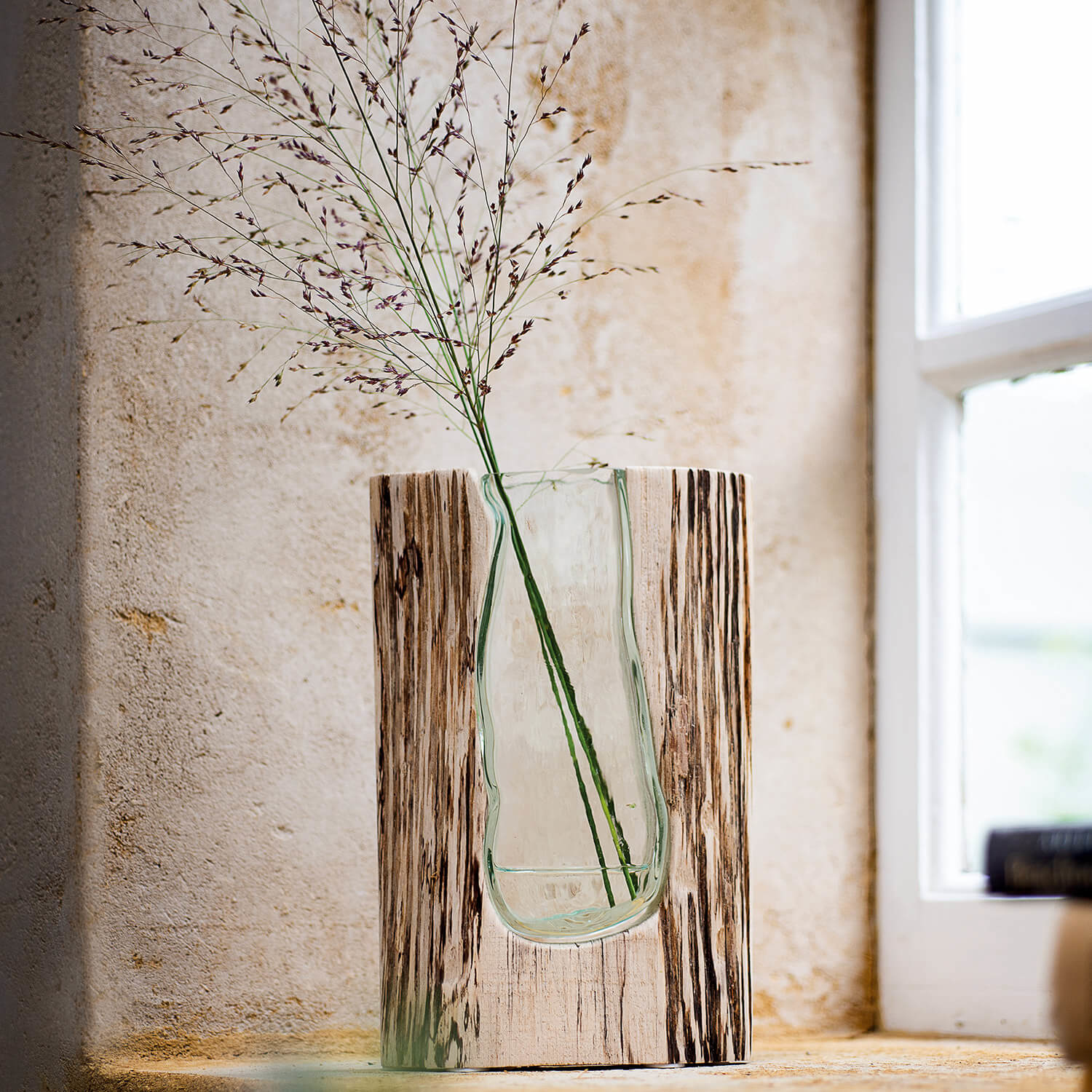 Holzvase • handgefertigtes Unikat • aus der Serie CASOLARE • passt zum Landhausstil • 2 kg • Holz und Glas • Maße: 36 x 20 x 9 cm (HxBxT)