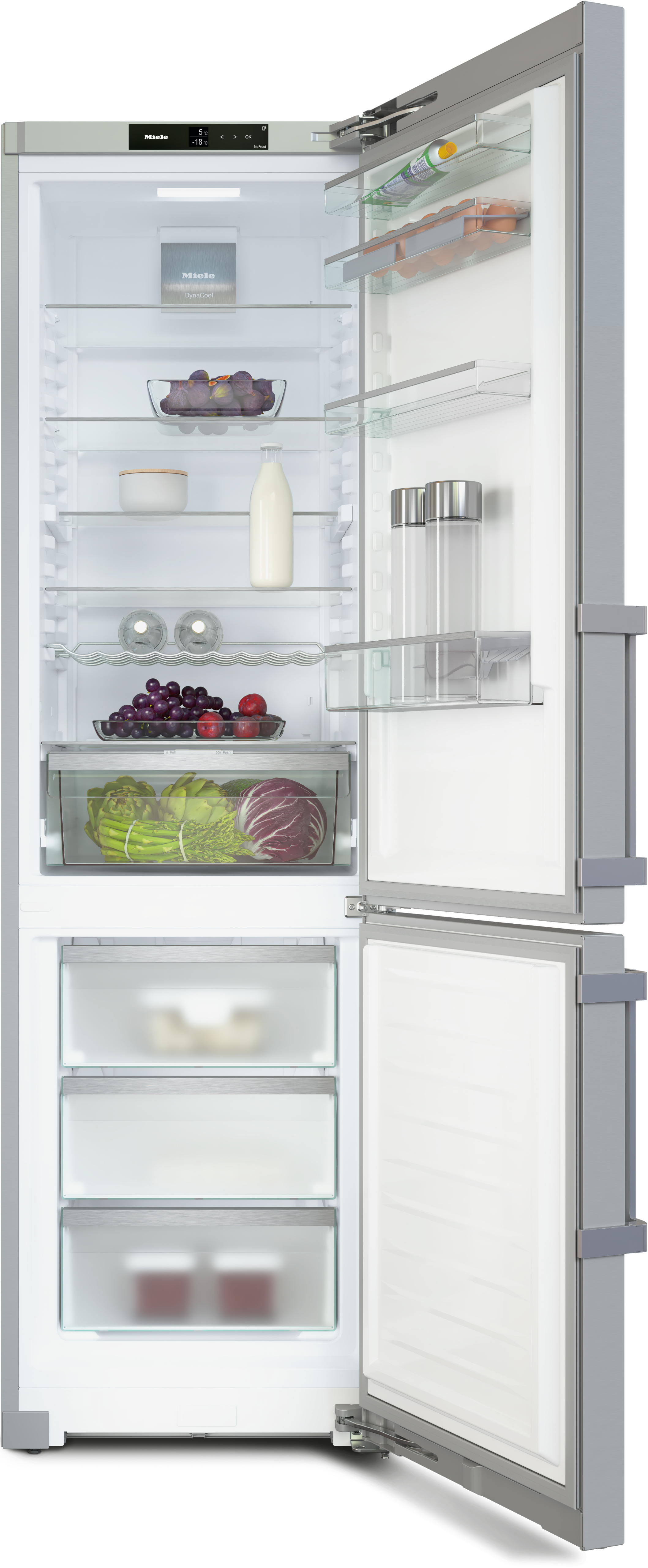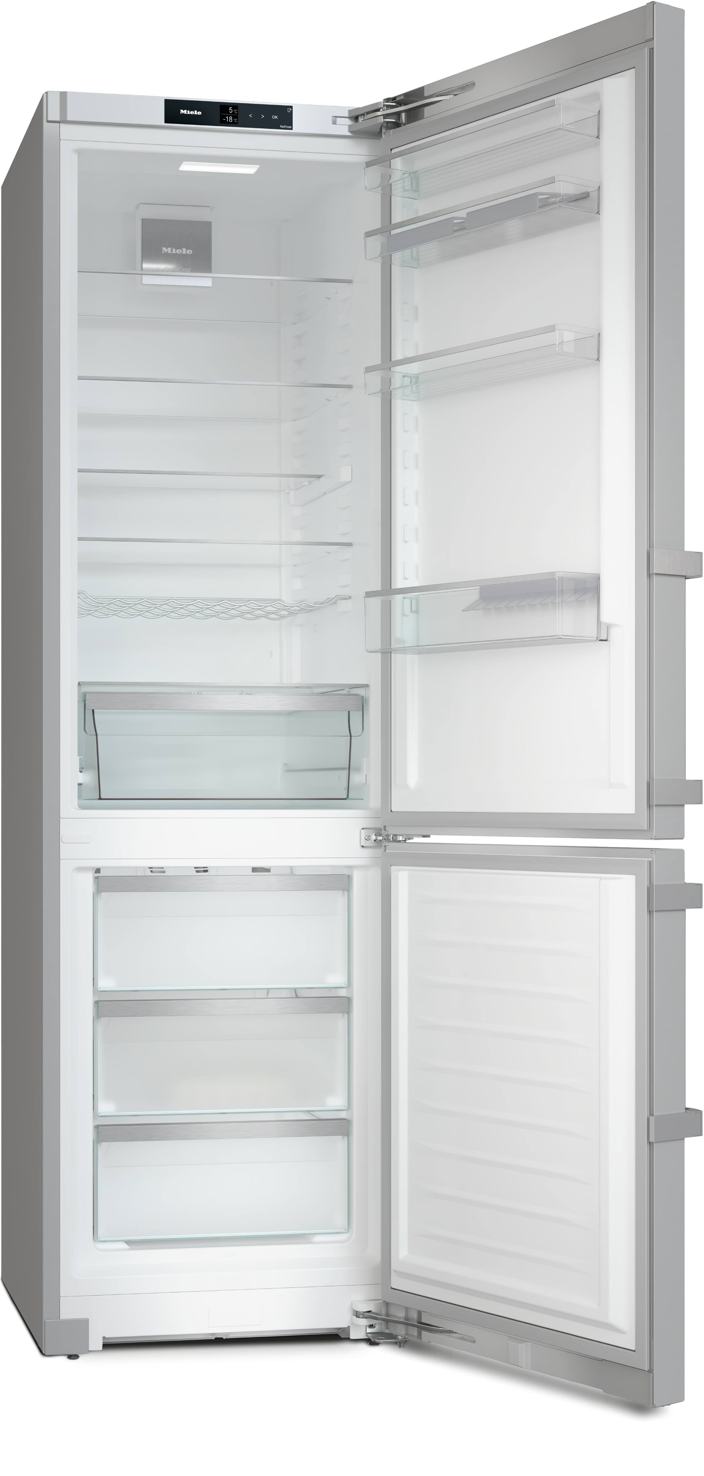 | Miele-Technologien (Lebensmittellagerung): | DailyFresh, DuplexCool, DynaCool, NoFrost, Party mode, Sabbath mode, SoftClose, SuperFrost, VarioRoom |