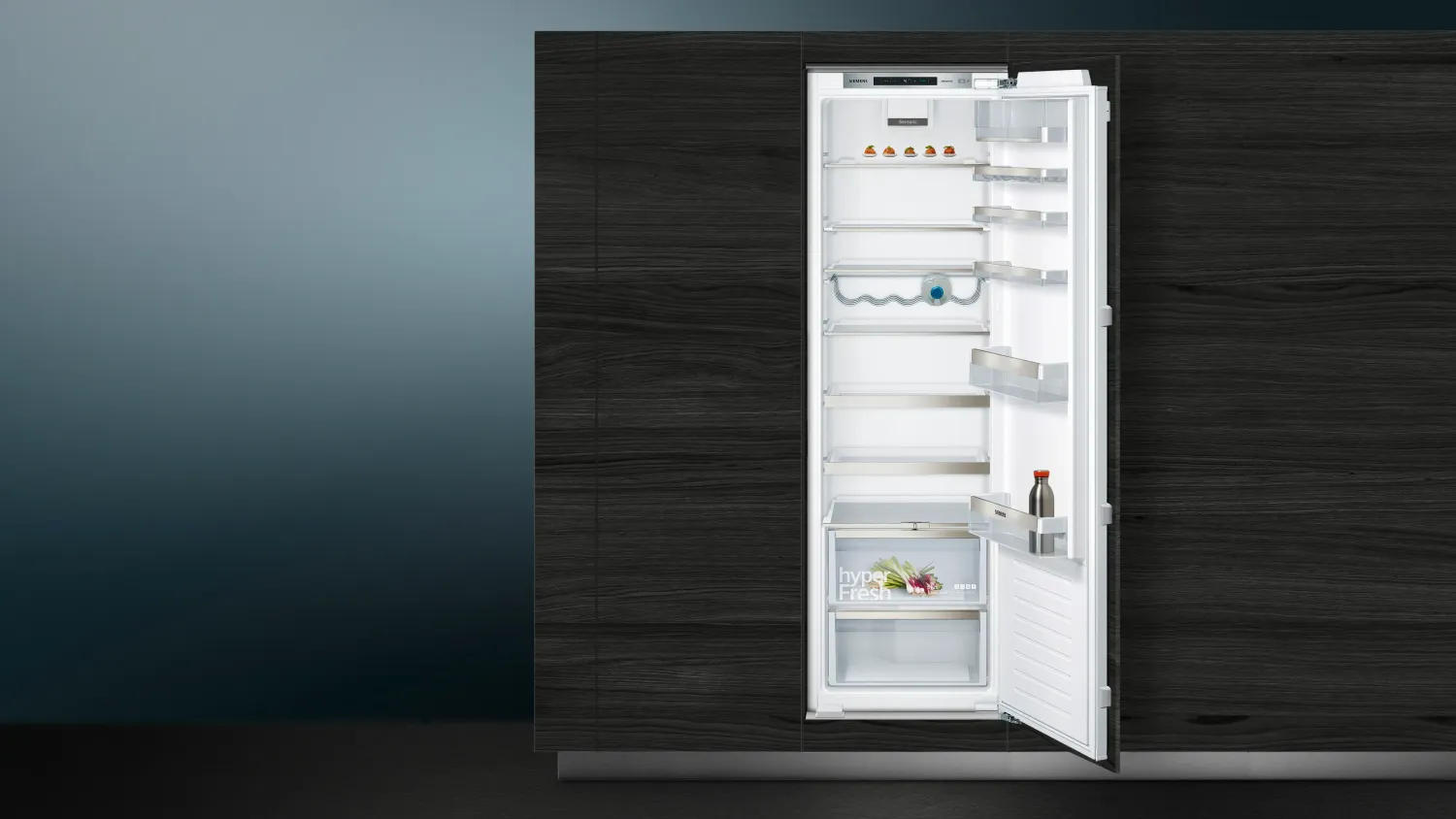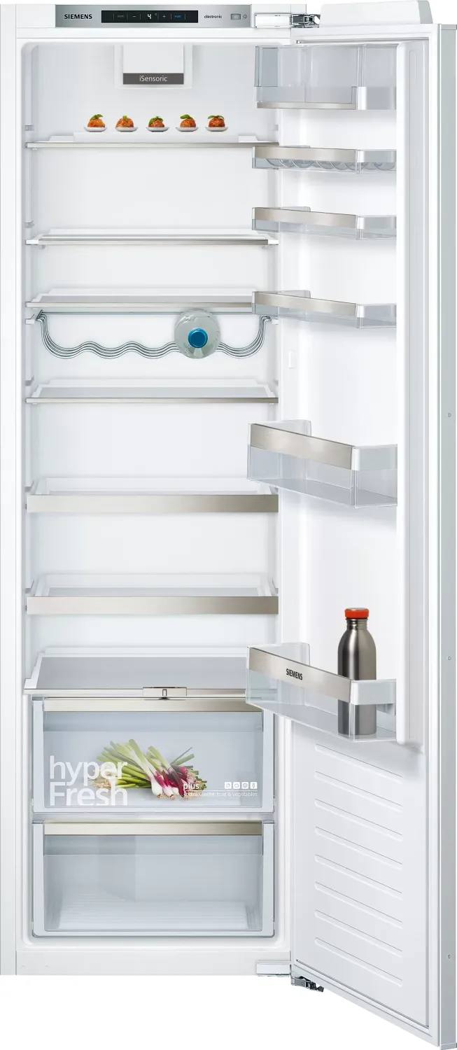 Bauart: integrierbar (Flachscharnier) • Energieeffizienzklasse: E (A bis G) • Energieverbrauch: 115kWh/Jahr • Frontfarbe: weiß • Seitenfarbe: weiß • Nutzinhalt: 319l • Display: ja • Besonderheiten: Gemüsefach (hyperFresh plus), Schnellkühlen, LED-Beleuchtung, Flaschenablage, teilbare Glasplatte (VarioShelf), Türeinzug mit Dämpfung, Türalarm • Smart Home: nein • Klimaklasse: SN/N/ST • Geräuschentwicklung: 37dB(A) • Luftschallemissionsklasse: C (A bis D) • Türsystem: Türanschlag rechts, wechselbar • Abmessungen: 558x1772x545mm (BxHxT) • Einbaumaße: 560x1775x550mm (BxHxT)