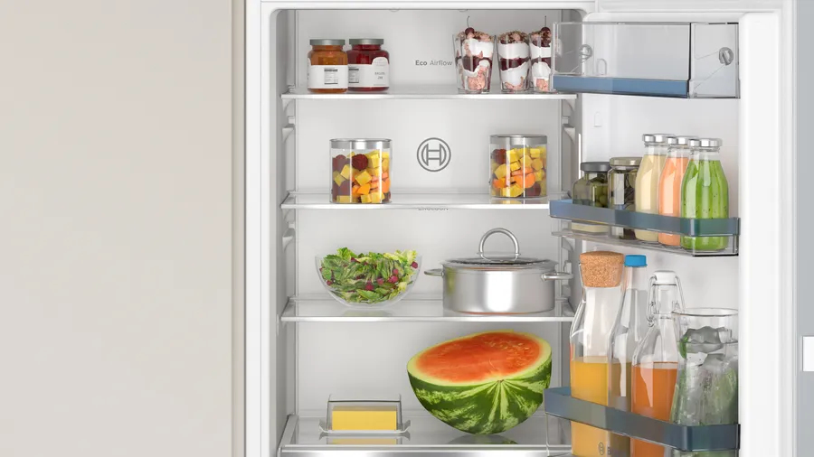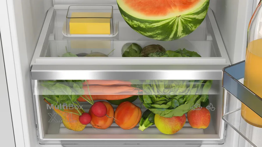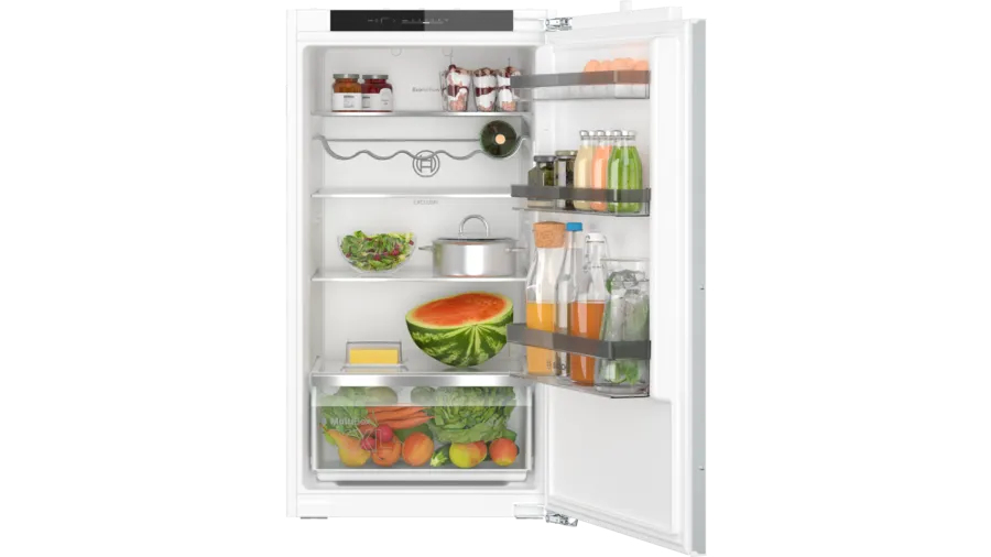 KIR31EFE0 Einbau-Kühlschrank, 102.5 x 56 cm, Flachscharnier. Der geräumige Einbaukühlschrank mit Multi Box XXL-Schublade für Obst und Gemüse und hochstabilen Türablagen sorgt für eine optimale Lagerung der Lebensmittel.