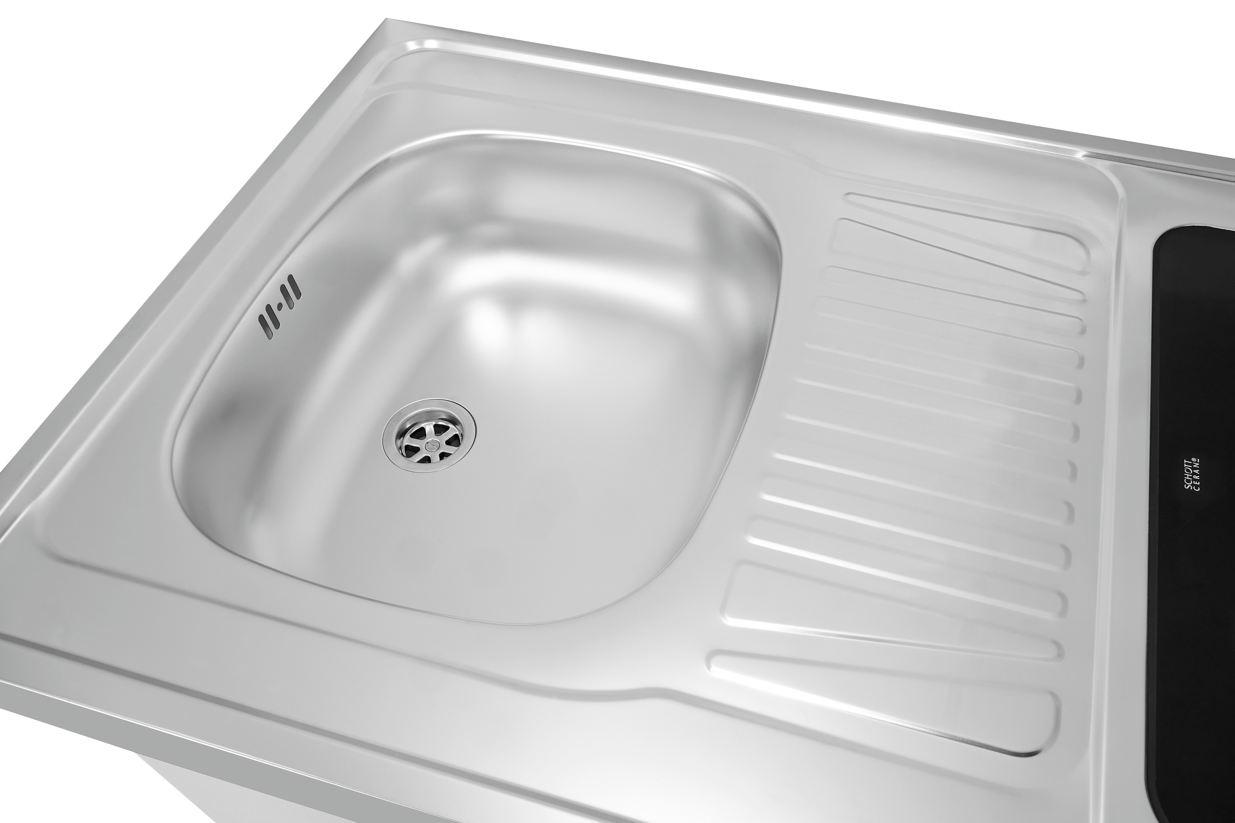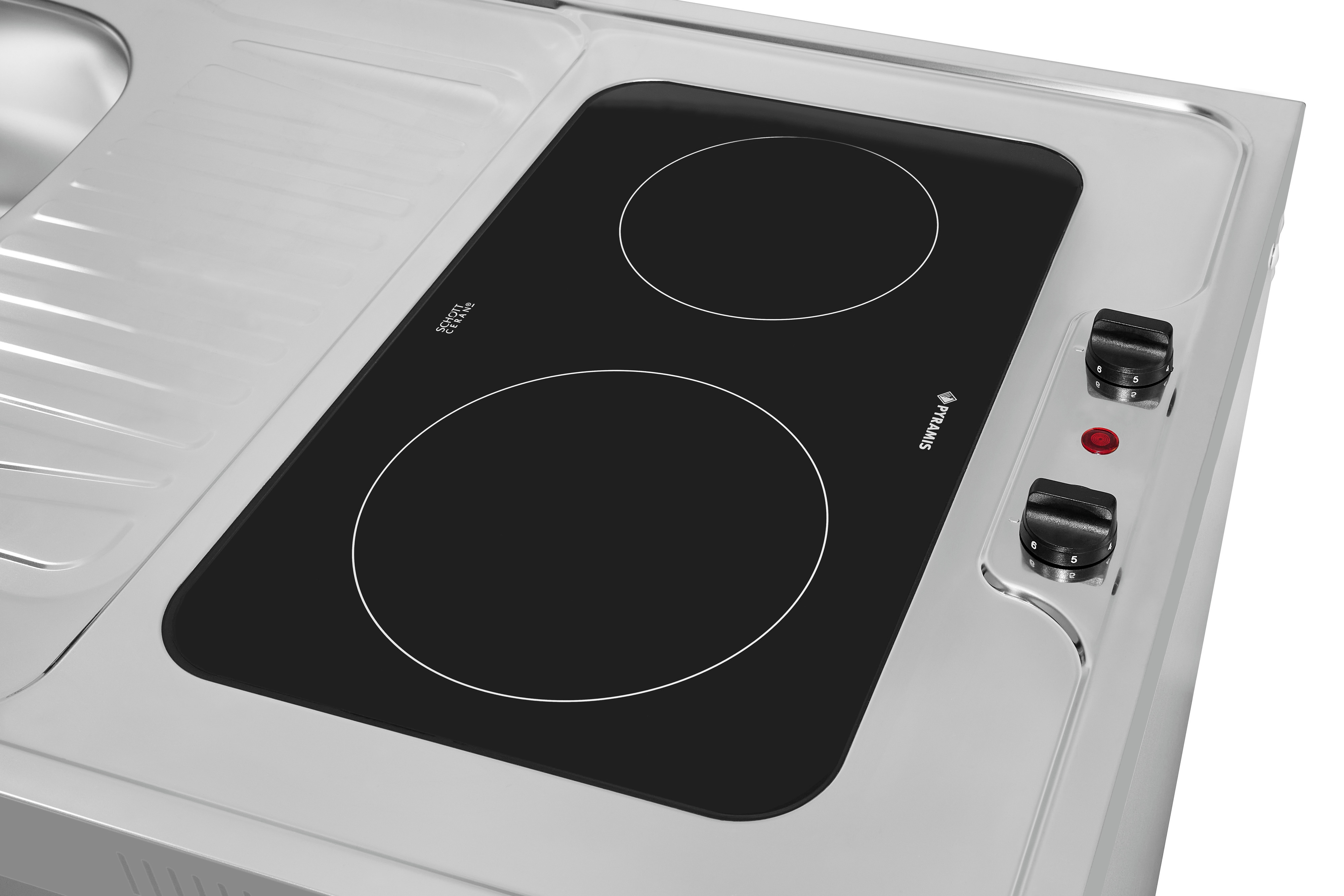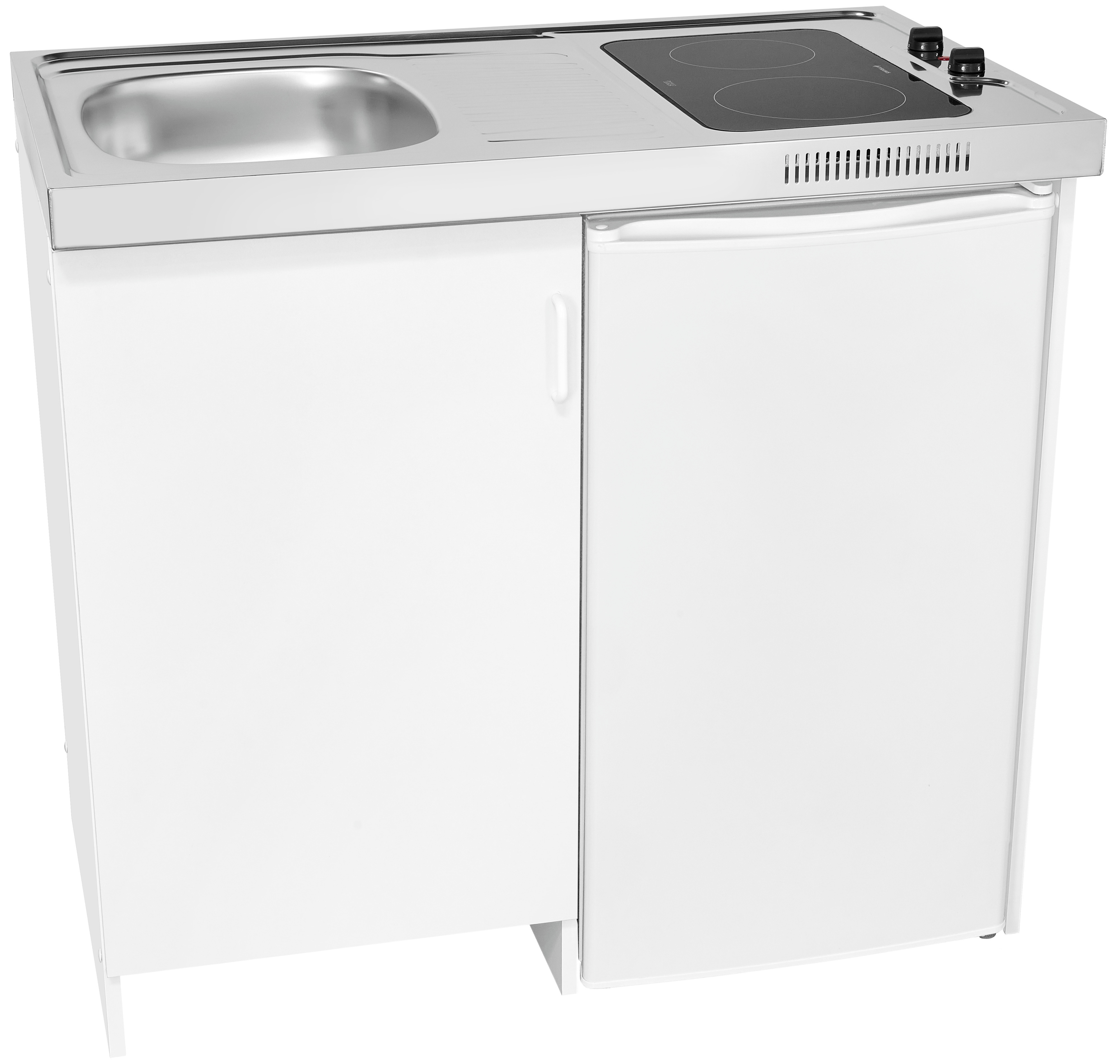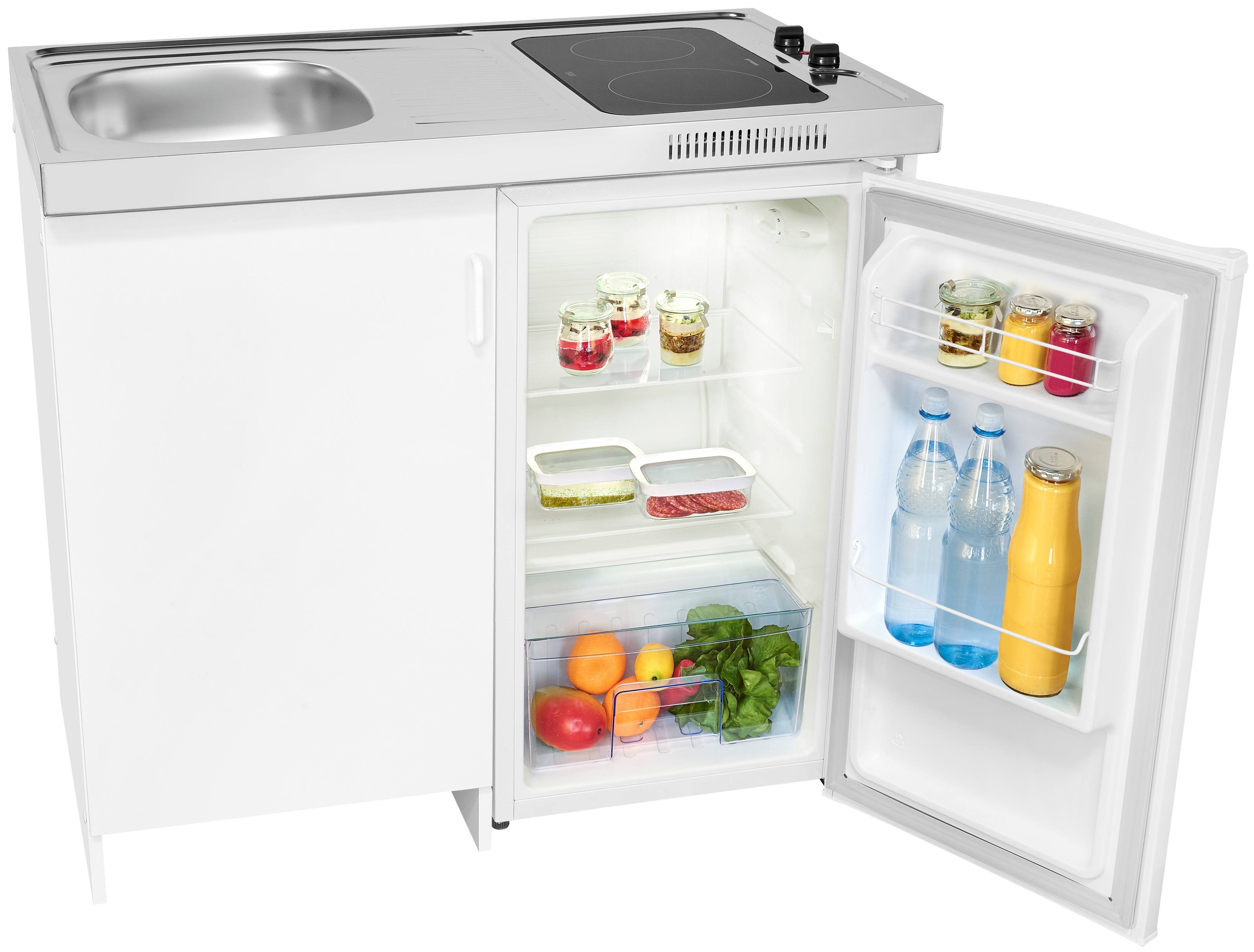 KK2085 (814021001) Set bestehend aus: KS85-VU-090E Kühlschrank, Spüle mit Duo Glaskeramik Kochfeld, Holzunterbauschrank. KK1085-Edelstahlspüle Glaskeramik-Kochfeld, Vollraumkühlschrank, Standgerät, Innenbeleuchtung, Temperaturregelung Manuell, Türanschlag wechselbar, Glasablage/verstellbar: 3 / 2, Türfächer/Flaschenregal: 2 / 1