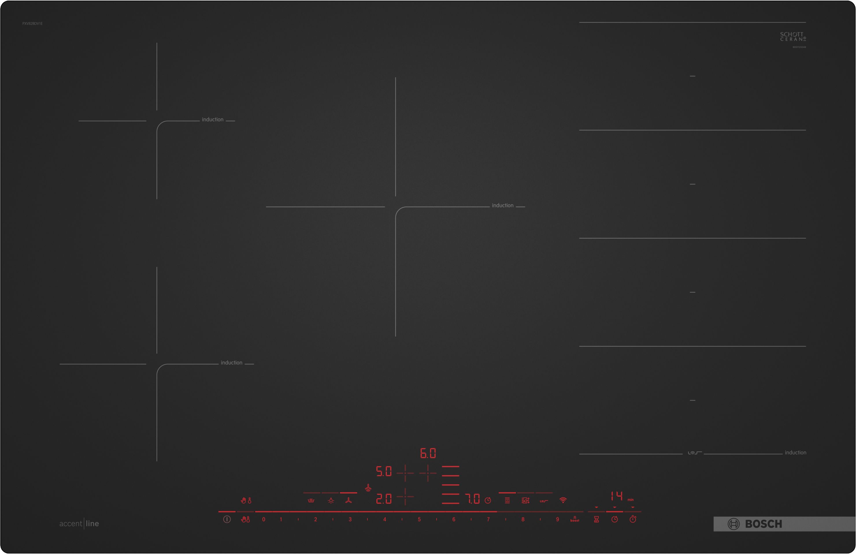 PXV82BDV1E Induktionskochfeld, 80 cm, Mattschwarz, flächenbündig (integriert). Die Flex Induction-Kochstelle: platzieren Sie mehrere Töpfe oder großes Kochgeschirr beliebig auf der flexiblen Kochzone.