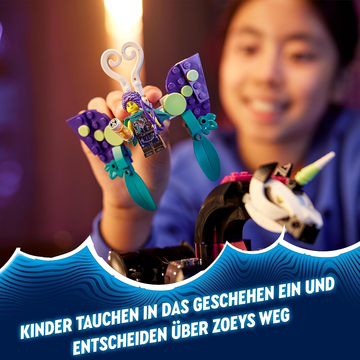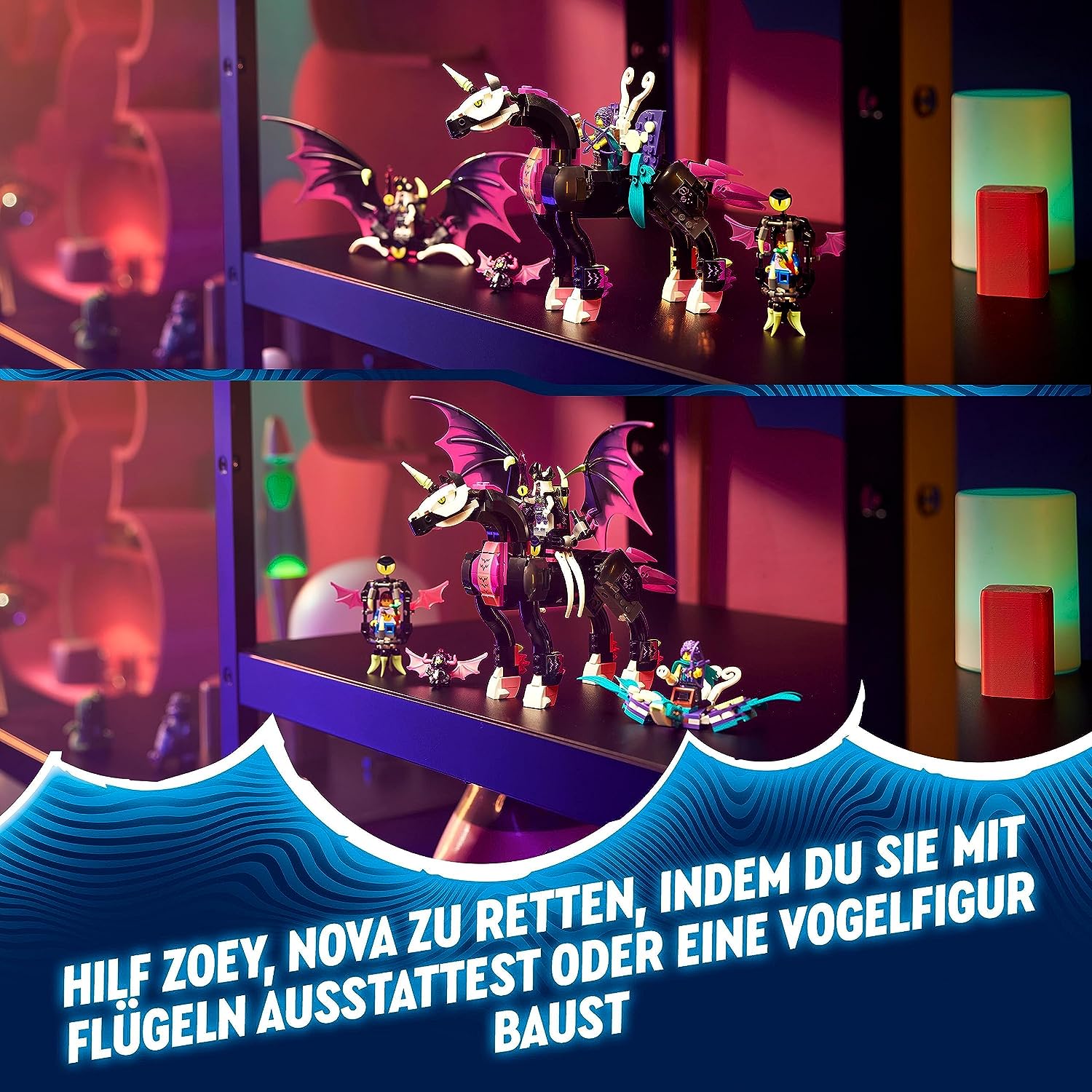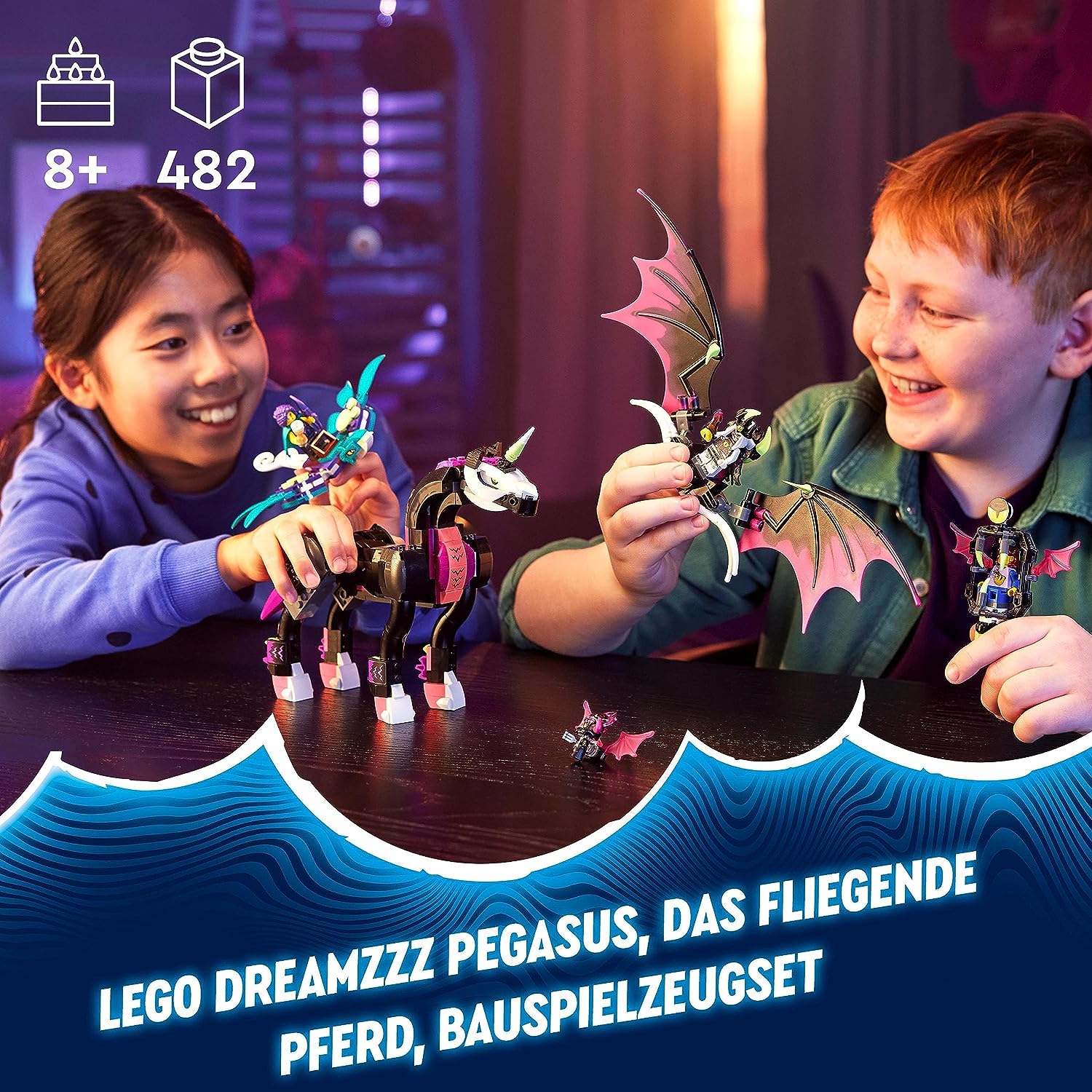 Schick Kinder ab 8 Jahren auf dem LEGO DREAMZzz Pegasus (71457) auf faszinierende Actionabenteuer in der Traumwelt. Das Bau- und Spielset basiert auf der TV-Serie DREAMZzz. Nova wurde von dem Albgnom Susan entführt. Doch Zoey ist den beiden schon auf ihrem Pegasus auf den Fersen, um ihre Freundin Nova zu retten! Die Bauanleitung in Form einer Bildergeschichte lässt dein Kinder in diese faszinierende Spielwelt eintauchen und fantasievoll spielen. Welchen Weg Zoey einschlägt, entscheidet dein Kind ganz allein.1 Bauset, 2 BaumöglichkeitenUm Zoey bei Novas Rettung zu helfen, kann dein Kind eine Vogelfigur bauen, die Zoey begleitet. Oder man kann Zoey mit Flügeln versehen, damit sie die Albträume verfolgen kann. Die beiden Baumöglichkeiten lassen dein Kind nicht nur besonders fantasievoll und kreativ bauen, sondern bieten auch den doppelten Spielspaß.Magisches Fabelwesen, fantastische DetailsDer Spielzeug-Pegasus kann seinen Kopf, seine Hüfte, seine Hufe und seinen Schwanz bewegen, damit dein Kind ihn beim Spielen in unterschiedliche Posen bringen kann. Man kann sowohl den detailreichen Thron des Albtraumkönigs als auch Zoeys Vogel auf dem Rücken des Fabelwesens befestigen.
