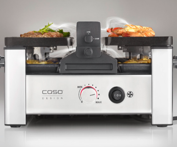 - Raclettegrill mit 8 antihaftbeschichteten Pfännchen (PFAS-frei) für bis zu 8 Personen