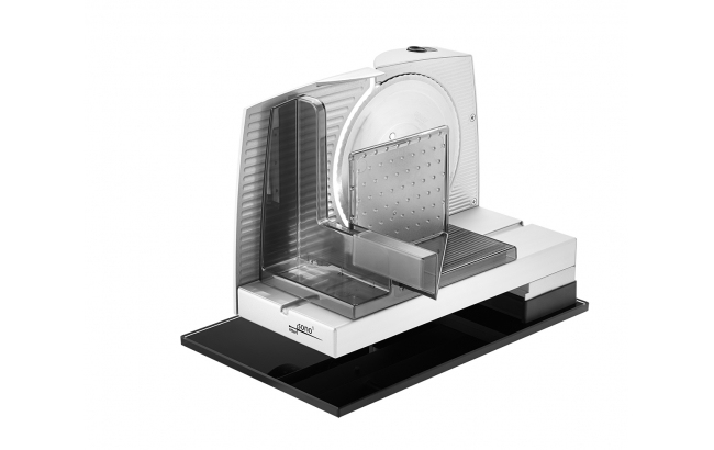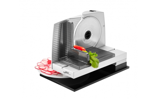 Elektro-Allesschneider, Metall-Ausführung, freitragende Konstruktion, Messerausführung: Wellenschliff, 170mm Durchmesser, Schnittstärkeneinstellung bis 20 mm, Schnittlänge bis 18 cm, Momentschaltung, Dauerschaltung, 65 Watt Leistung